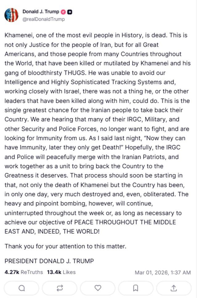 Təcili: Tramp Xameneinin öldüyünü elan etdi