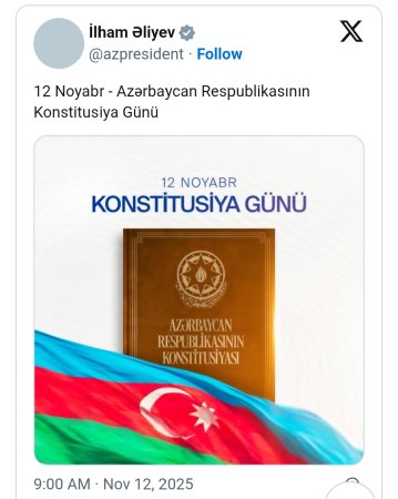 12 noy202509:56 46 Tel:+99450 352 82 91 E-mail: turkdunyasi.az@mail.ru yuxarı Prezident İlham Əliyev Konstitusiya Günü münasibətilə paylaşım edib 12 noy, 202509:56 1246 Azərbaycan Prezidenti İlham Əliyev 12 Noyabr - Konstitusiya Günü ilə əlaqədar sosial şəbəkə hesabında paylaşım edib.Turkdunyasi.az paylaşımı təqdim edir.