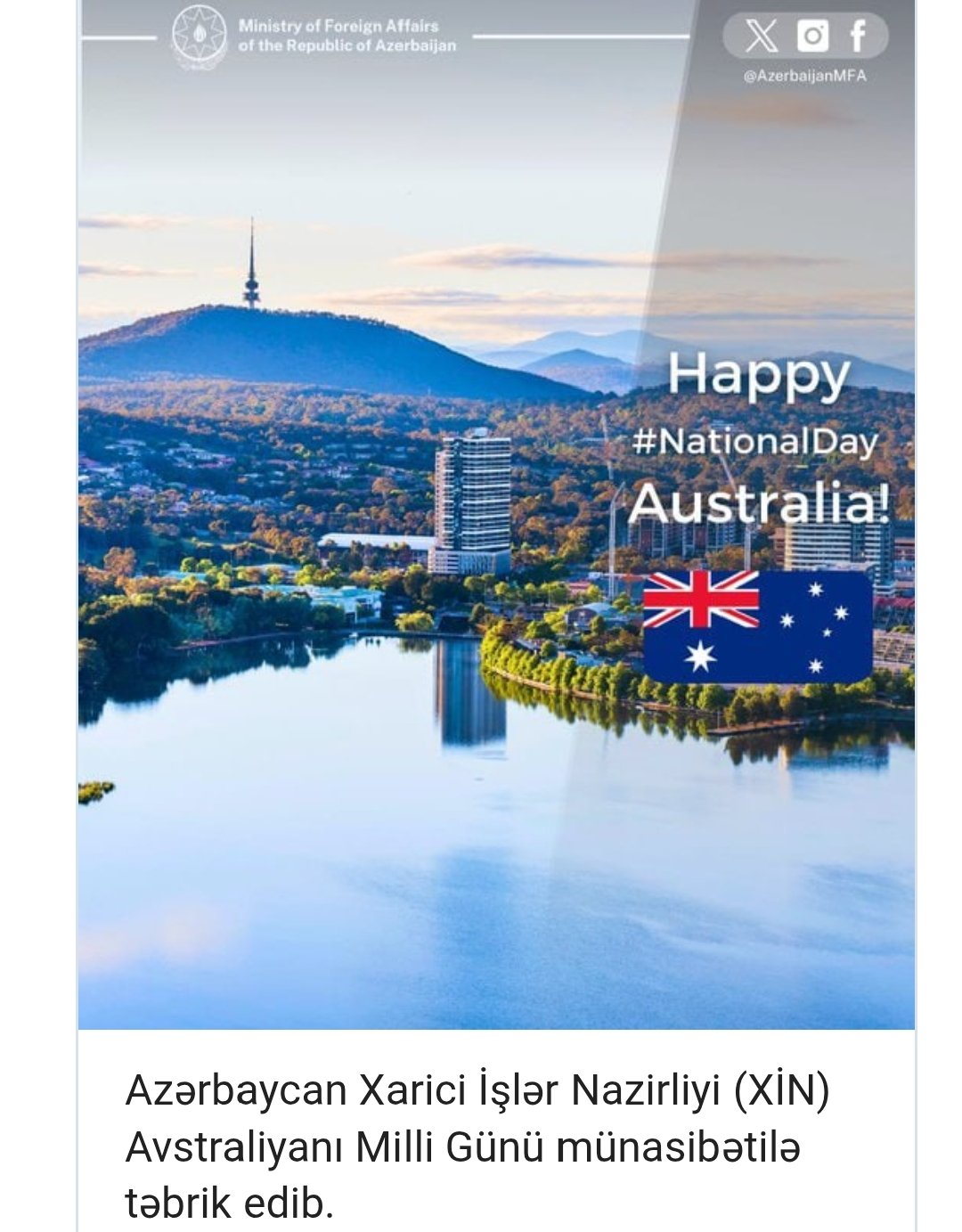 Azərbaycan Xarici İşlər Nazirliyi (XİN) Avstraliyanı Milli Günü münasibətilə təbrik edib.